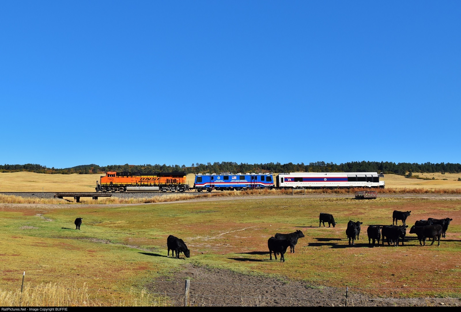 BNSF 7955 (ES44C4) leads a Federal Railroad Administration Office of Safety DOTX track measurement car, which worked the Joint Line as it passed a bunch of cows in Spruce, Colorado.