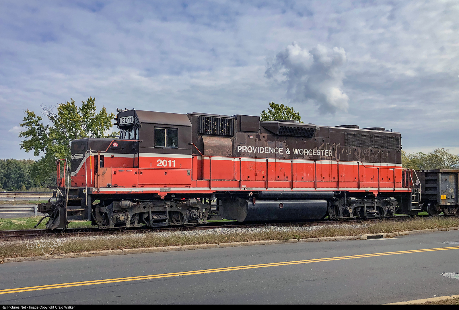 Handling a train of gondolas is Providence & Worcester GP38 2011. Built as Penn Central 7794 by EMD in October 1969 (54 years earlier), this locomotive became Conrail 7794 when that railroad was created (and included PC in its creation) in 1976. CR later sold it to PW, where it initially retained its number (as PW 7794) before getting renumbered, as seen here. (Middletown, Connecticut – October 18, 2023)