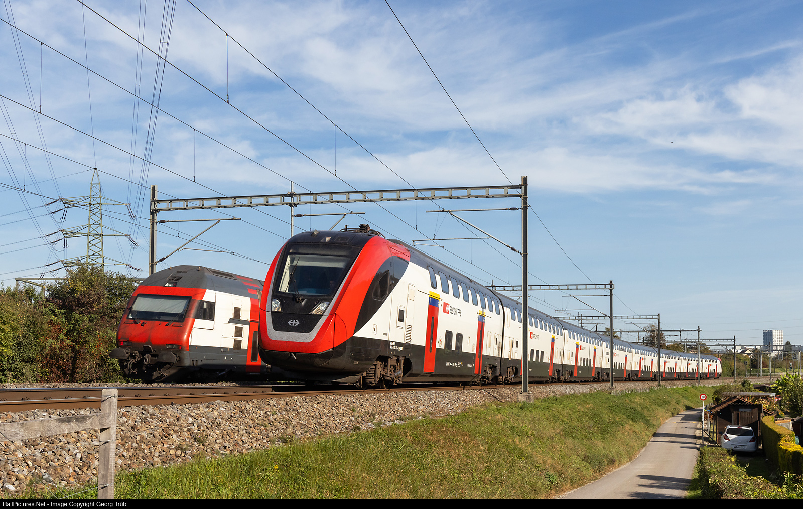 | "FVD" RABe 502 # 224 of the Sbb running as IR 3262 from Altstätten via St.Gallen to Zürich, between Winterthur and Winterthur Tössmühle, meeting a IC2000 doubledeck train in the opposite direktion with cab car Bt in the rear. |