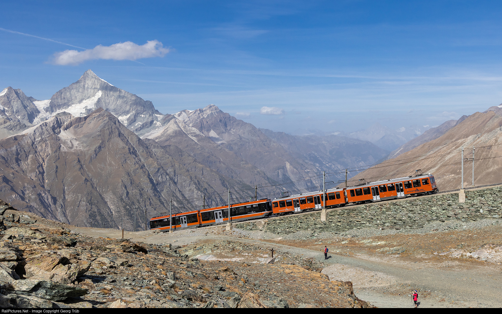 | SLM built Bhe 4/8 # 3053 and StadlerRail built POLARIS Bhe 4/6 # 3094 of the Gornergatbahn (GGB) in multiple control are running up from Zermatt to the Gornergrat, with the Weisshorn in the background. |
