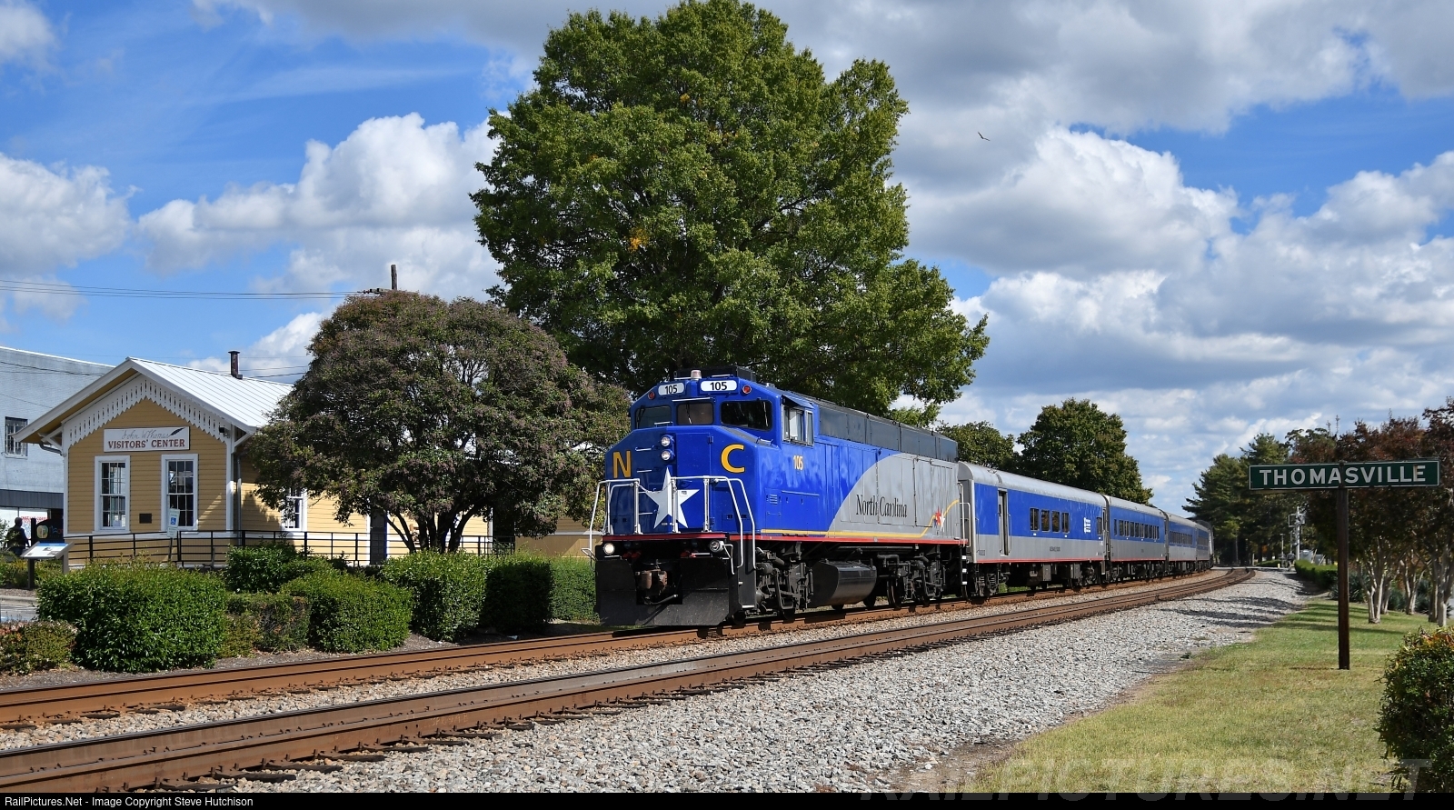| Piedmont Train #73 races southbound past the depot in Thomasville North Carolina. On the head end is Cab Control Unit #105 formerly GO Transit F59PH #521. This unit was rebuilt by Norfolk Southern Juanita Shops for the North Carolina Department of Transportation in 2018. |