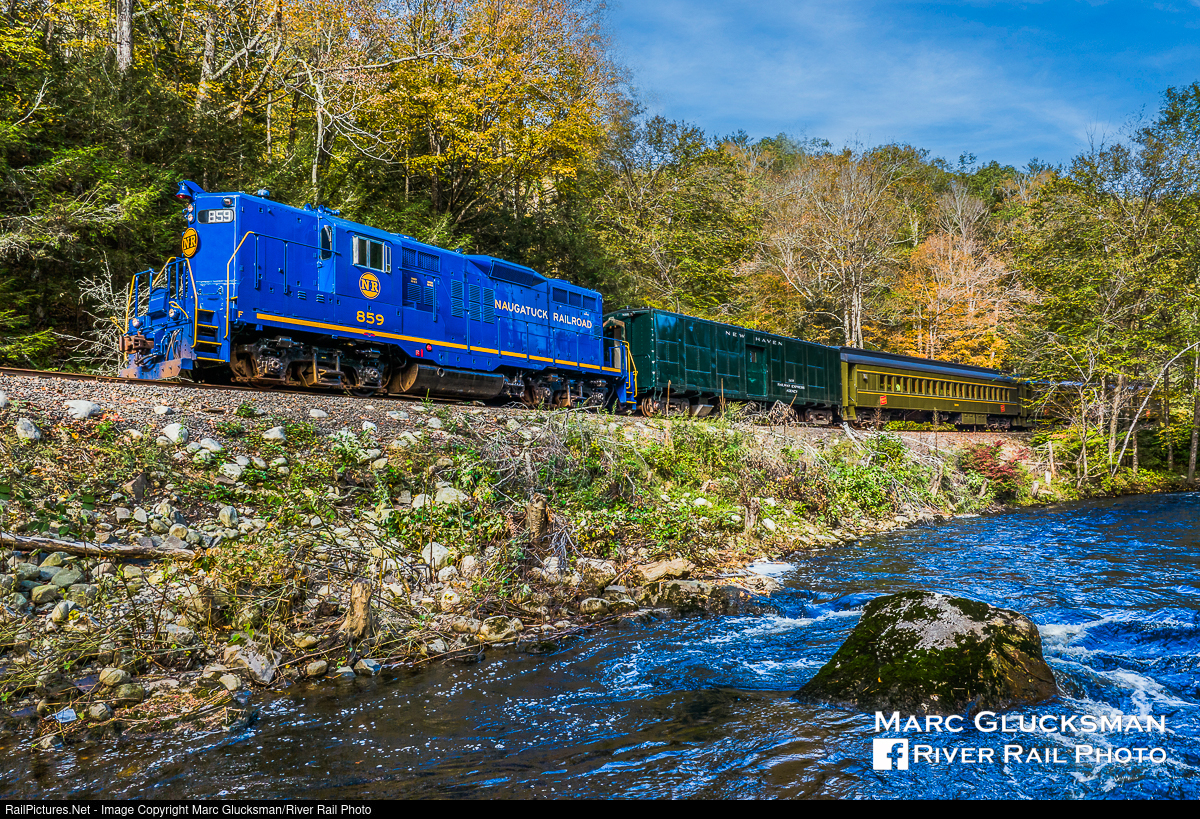 Morning At The Grotto. In an isolated area nicknamed "The Grotto" by the railroad in East Litchfield, Connecticut, the train passes next to the Naugatuck River. Railroad Museum Of New England In The Autumn. On Monday, October 9, 2023, NAUG 859 (née-NW 859, GP9, 6/1959) was the power for a special photo excursion to highlight some of the areas that are difficult to access without riding on the tourist train ride on the Railroad Museum of New England/Naugatuck Railroad to demonstrate different angles for the public. Throughout the day, the train traveled from the restored vintage New Haven Railroad station in Thomaston, Connecticut (where the railroad has a parking lot, facilities , and a gift shop) north up into East Litchfield and south to Jericho Bridge crossing the Naugatuck River to showcase the train in its natural environment.