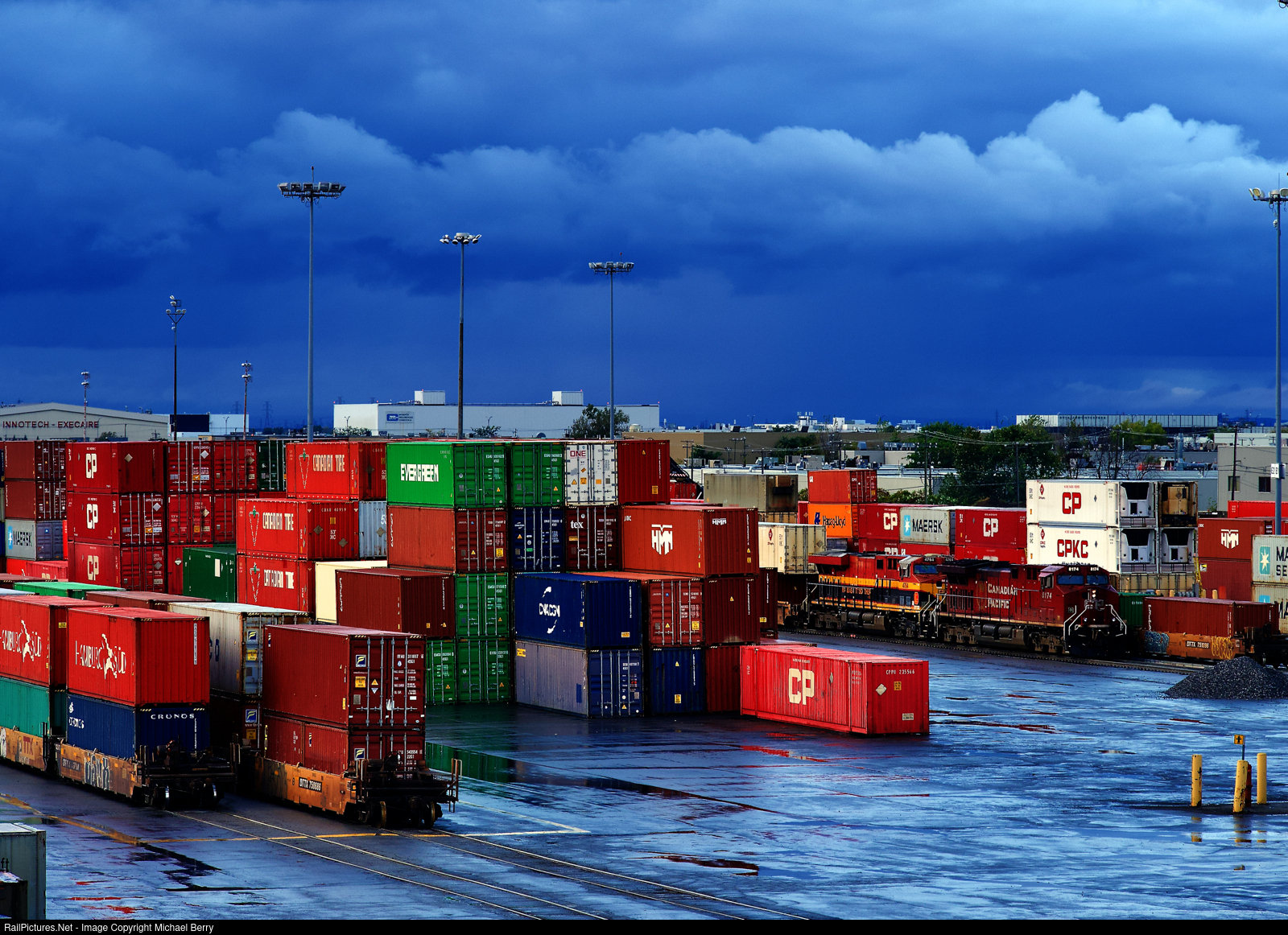 A CPKC container is above the mixed CP/KCS lashup as CPKC 119 lifts intermodal traffic at Lachine IMS.