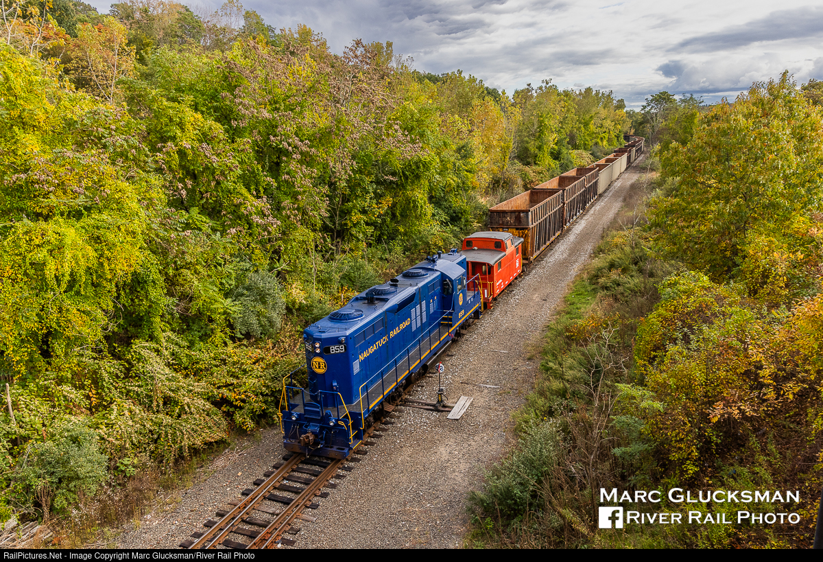 Trains Get Longer. Unthinkable when the freight operation started with a few cars at a time a few years ago, NAUG 859 (GP9) brings its caboose and an astounding 28 empty cars north approaching the Route 8 bridge in Waterbury, Connecticut. On the afternoon of Tuesday, October 17, 2023, Genesee & Wyoming's Berkshire and Eastern Railroad (Formerly Pan Am Southern) PL-1 brought down 28 empty cars for the Naugatuck Railroad Freight and returned with 18 loads. The purchase of Pan Am Railways by CSX and subsequent division of assets and delegation of routes brought the Berkshire & Eastern Railroad into existence to operate lines separated out from CSX and Norfolk Southern operations. The Naugatuck Railroad, operator of this former Boston & Maine and originally New Haven Railroad line, has been operating Torrington Secondary with tourist passenger service since 1996 and added regular revenue freight to its portfolio in recent years.