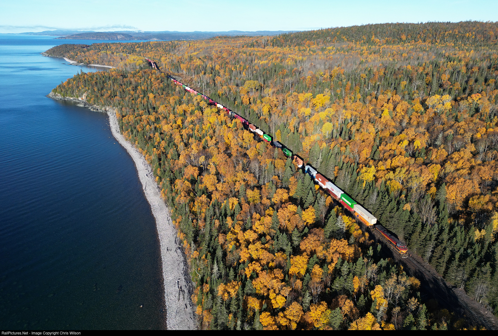 | Montreal Hochelaga, PQ - Vancouver Coquitlam, BC stacks ease along the shores of Lake Superior heading through Jackfish. CPKC train 118-19 is sitting in the siding waiting to be cut loose once 113 clears. |