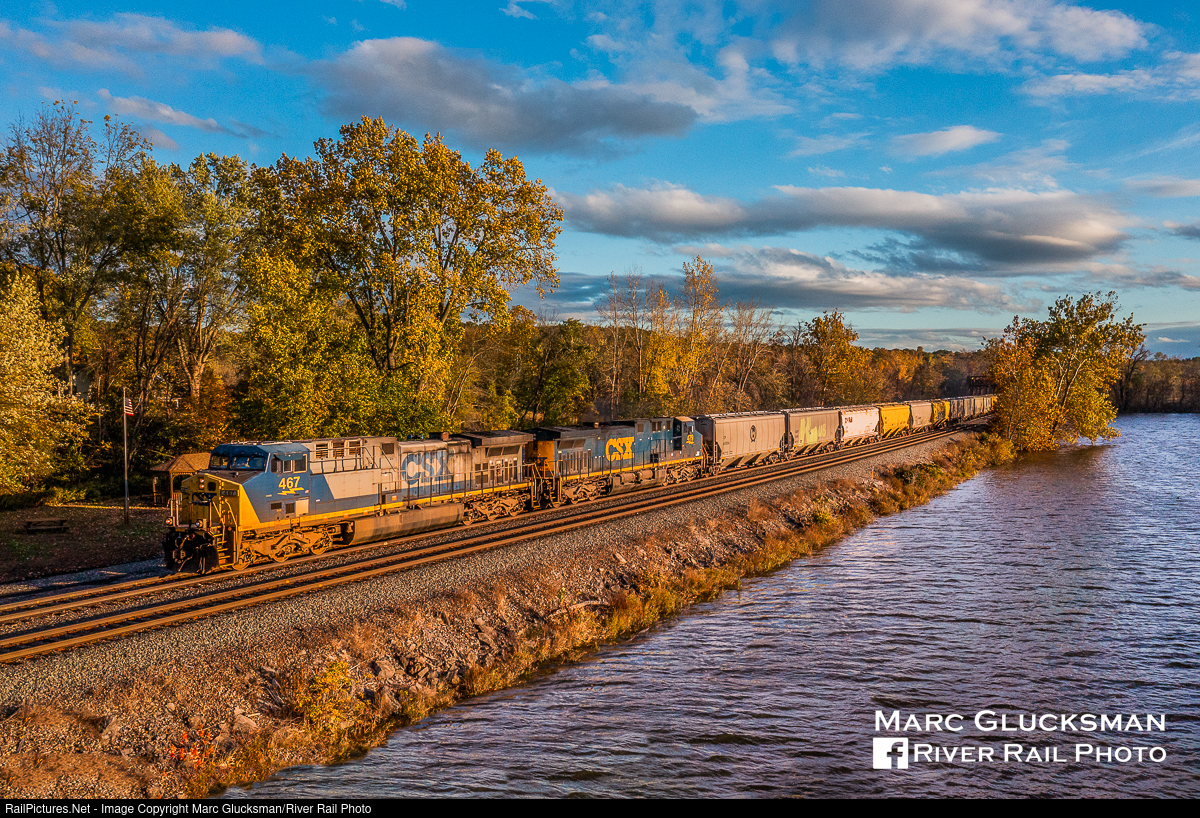 Grainy Fall Foliage. Peak Hudson Valley color for the year was showing around sunset on Friday, October 22, 2021 as CSX B765-22 (CSXT 467, AC44CW leading) was returning to Selkirk Yard. The train is traveling next to the Hudson River while passing through Stockport Station Depot Park in Stockport, New York with grain cars that had been delivered to the mill in Hudson, New York and are now returning empty. This was a fortunate catch as the train does not always run round trip from Selkirk to Hudson, and when it does it is normally the only CSX train that can be seen here in daylight.