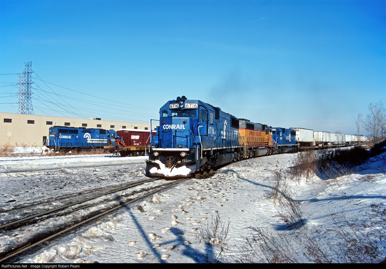 | Conrail TV-10 approaches 69th Street in North Bergen Yard at 11:15am on a crystal-clear winter morning. Conrail 3401 idles in the background on the Northern Branch with what may be local NB-51. The Union Pacific unit trailing on TV-10 was a former Missouri Pacific SD40-2 that was demoted to B-unit status.