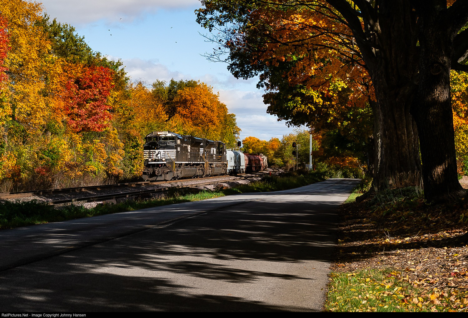 Fall on Otis Hill. A sunny Sunday, and sweater weather kind of fall afternoon finds us in the backwoods of Northern Indiana photographing as many trains as we could with fall colors around Otis, IN, where the start of fall peak 2023 is underway all along Otis Hill. Otis Hill Is a great place for consistent train action and amazing fall colors. One of the trains i photographed that afternoon was Norfolk Southern train B10 from Elkhart, IN to Burns Harbor, IN. This train had a pair of SD70M-2 locomotives leading, numbers 2662 and 2665. These engines were hard to come across for several years since they were in storage, and have only been reactivated since the summer.