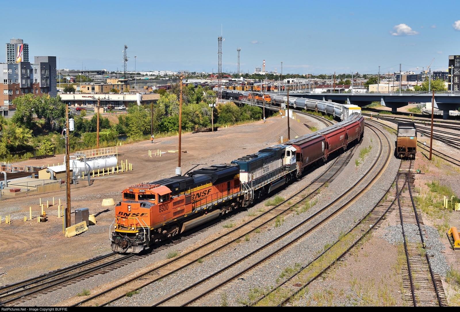 | BNSF 8500 (SD70ACe) leads the beer train out of the Denver Yard and will head to the Coors Brewery in Golden, Colorado.