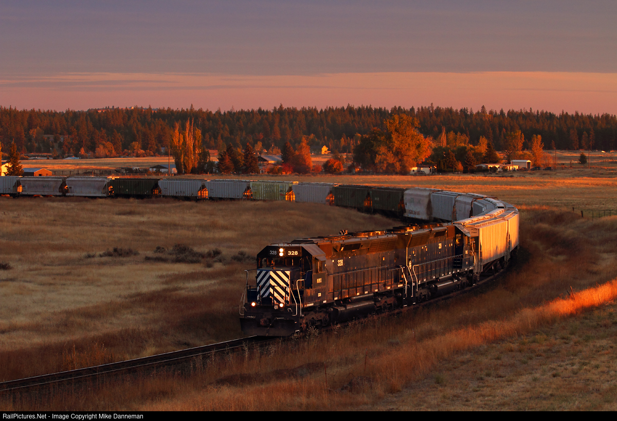 The very last sunlight of October 11, 2018, softly illuminates a westbound Eastern Washington Gateway Railroad grain train grinding through the curves west of Deep Creek, Washington. The train is powered by two former Montana Rail Link EMD SD45s—Nos. 328 and 329. The EWG only had a few more weeks to survive, with its last train operating on the former BN/BNSF CW Subdivision branch to Coulee City on November 3, 2018. The track is owned by Washington State Department of Transportation and now has a new operator.