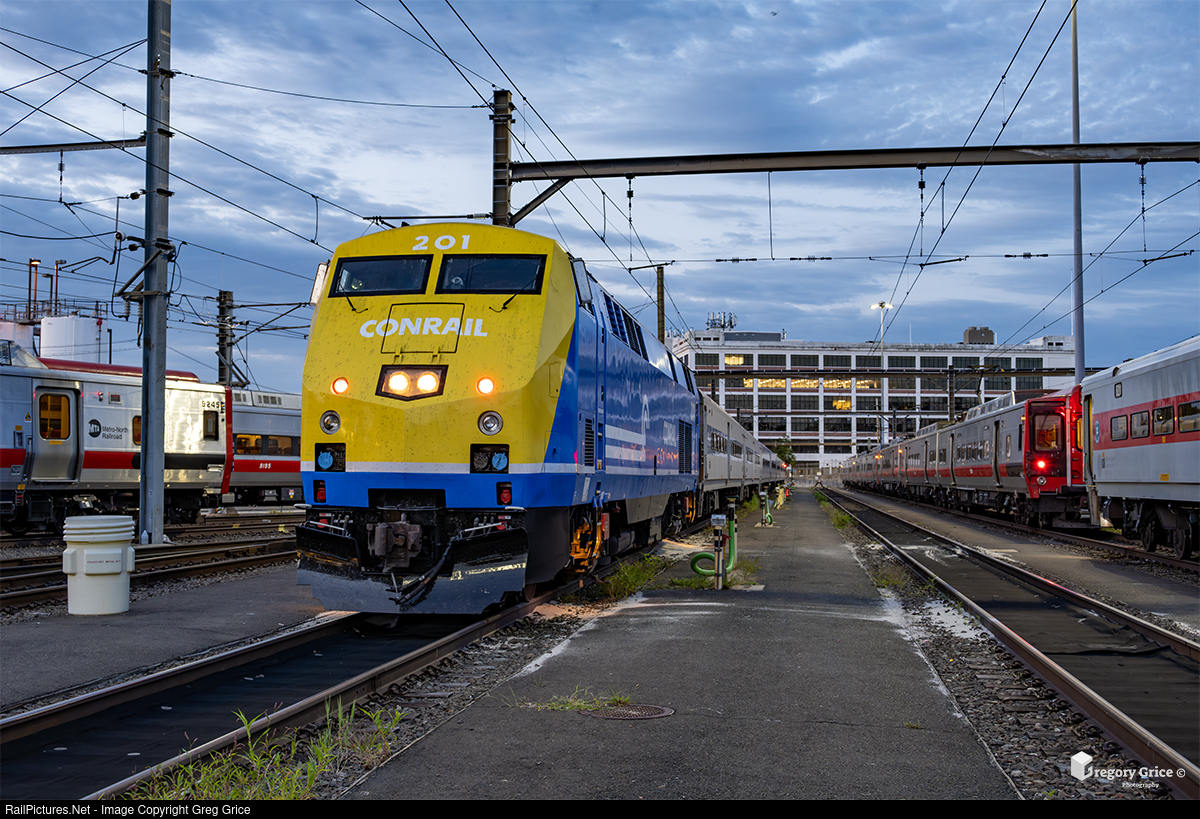 As the sun begins to rise on the morning of September 3rd, 2023, Metro-North's 40th Anniversary "Conrail" heritage-wrapped P32AC-DM, MNCW 201, lays over with its maxi-bomb consist, surrounded by New Haven Line (CDOT) equipment at New Haven Yard in Connecticut.
