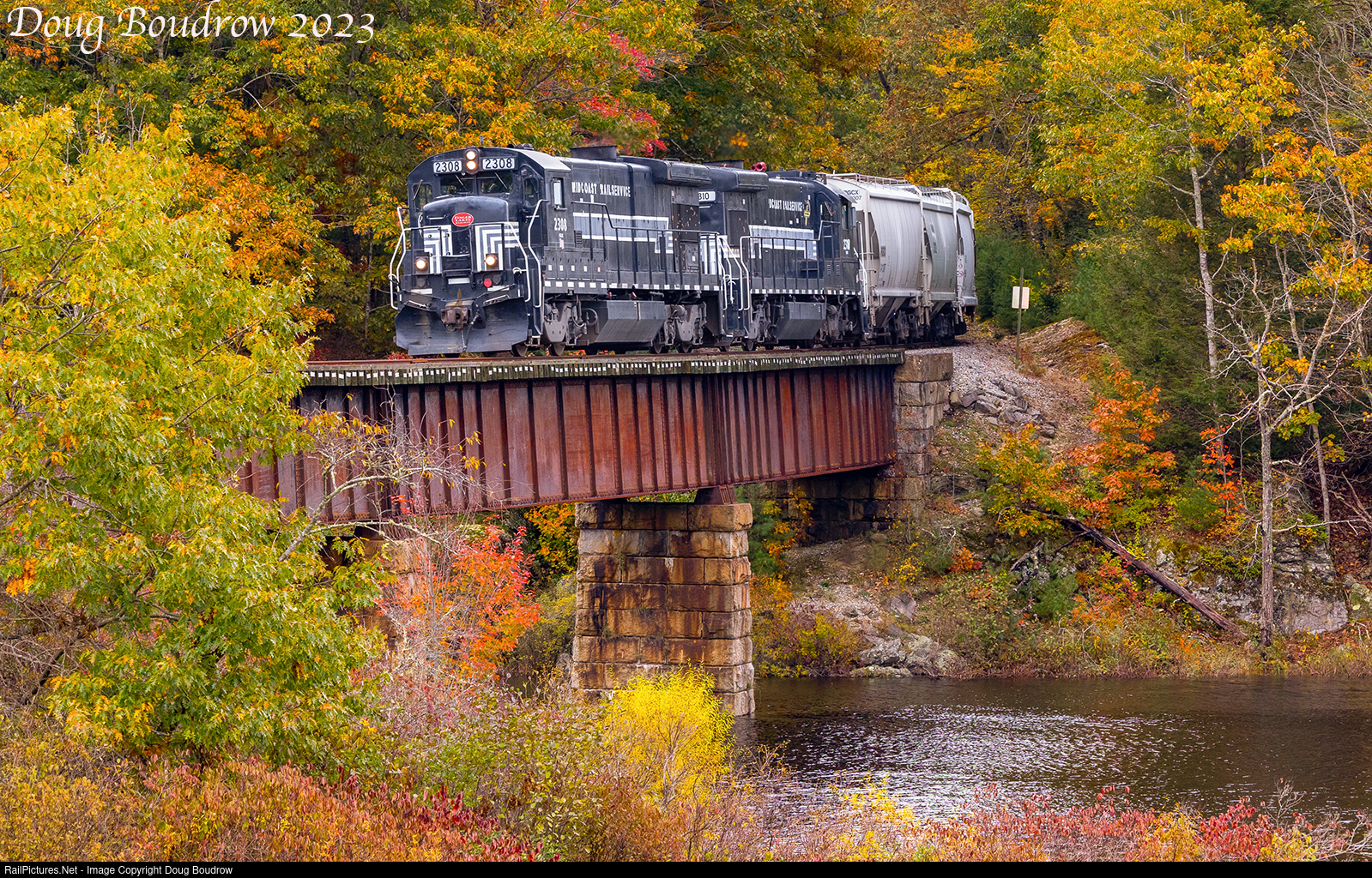 | Midcoast Rail Service RB-2 is seen crossing Nequasset Brook in Woolwich. On this day the crew has both engines and 11 loaded hoppers from the Dragon Cement plant in Thomaston. With the plant slated to close at the end of the year, the future of this line is uncertain. |