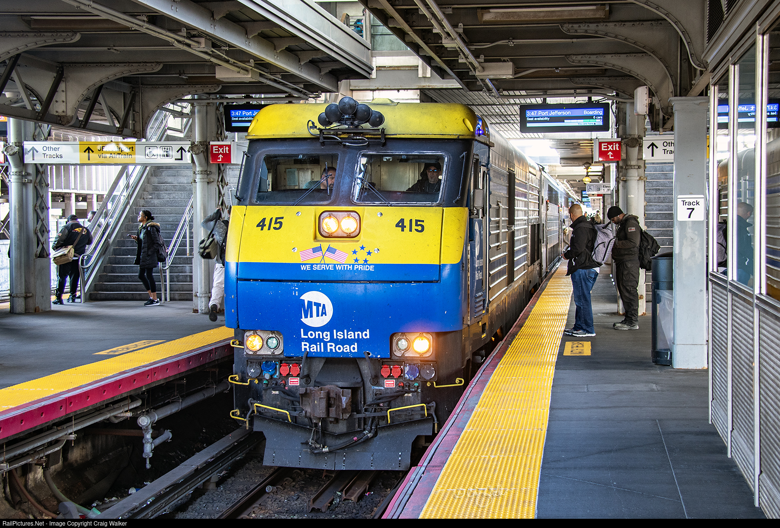 Long Island Railroad DE30AC 415 leads a train heading from Long Island City (just across the East River from Manhattan) to Port Jefferson, in Suffolk County, New York, on the North Shore of Long Island with a population of about 8000. The train is making a stop on Track 7 in Queens' Jamaica Station as it heads to "Port Jeff," roughly 60 miles from heavily populated New York City. (New York, New York – October 24, 2023)