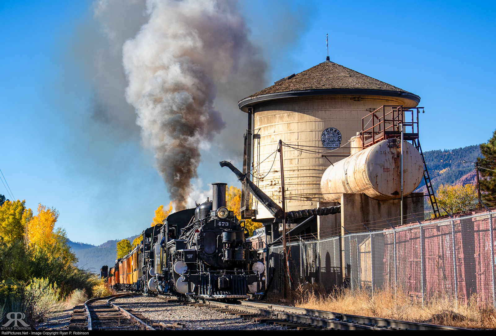 | Train 463 to Silverton is 10 miles into their 45-mile journey to Silverton as they pass the decommissioned wooden DRGW water tank at Hermosa. It was general practice to space these tanks every 10 or so miles. The steel tank is still in as-needed service. |