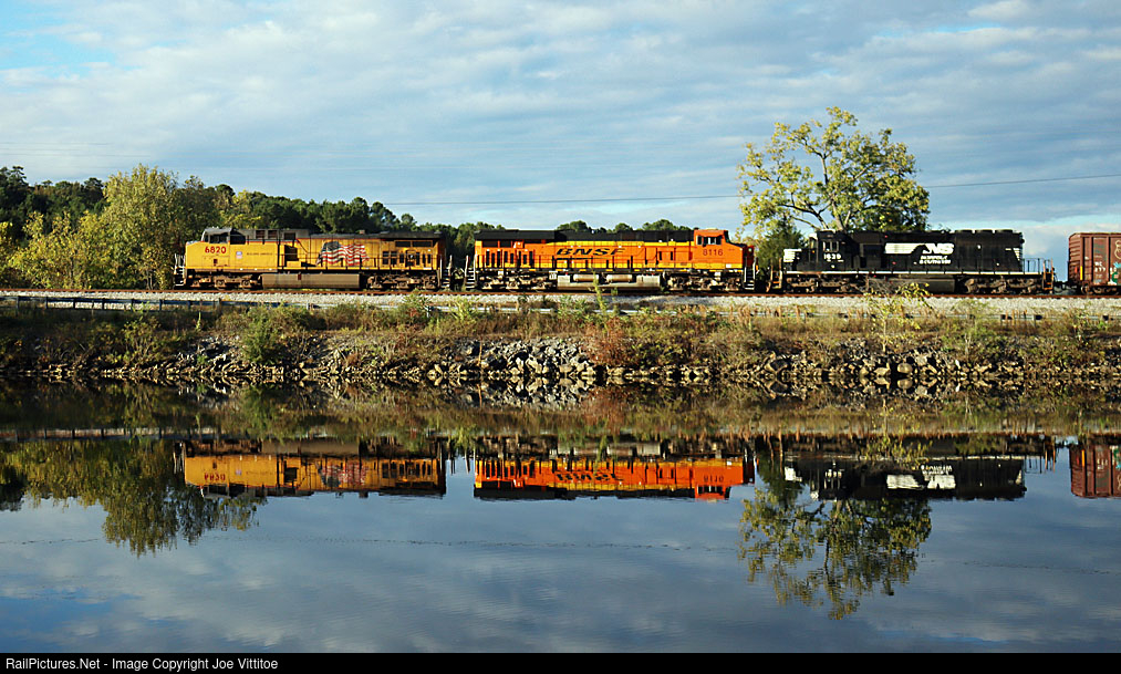 Heading north over CSX rails before getting on the NS a trio of UP, BNSF and a NS SD40-2 is reflected in the back waters of Lake Nickajack.