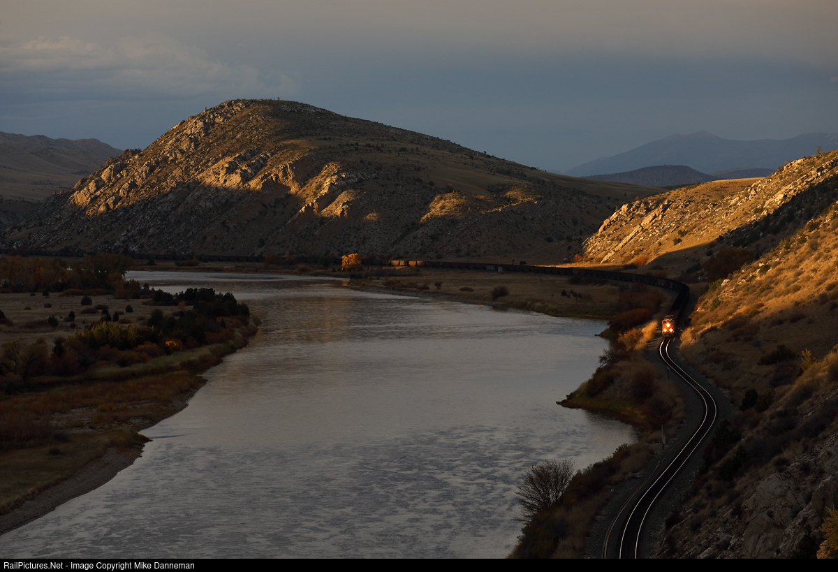 It’s October 10, 2023, at 6:15 p.m. and the last rays of sun are shaped by a mountain ridge to the southwest as the lead locomotive of a BNSF coal train momentarily gets illuminated by golden light. The eastbound train is following the Missouri River through some remarkable landscape between Clarkston and Trident, Montana, on Montana Rail Link’s Second Subdivision main line.