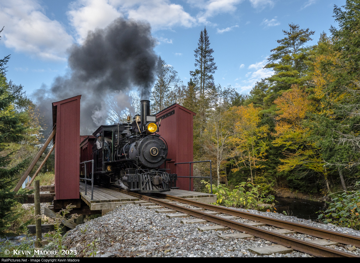 A little fall color at Trout Brook. A little fall color is in evidence as Wiscasset, Waterville & Farmington Railway Locomotive #9 charges through the boxed pony truss bridge over Trout Brook as it begins its 3.5 mile, southbound journey from Trout Brook Station back to Sheepscot, in the town of Alna, ME.