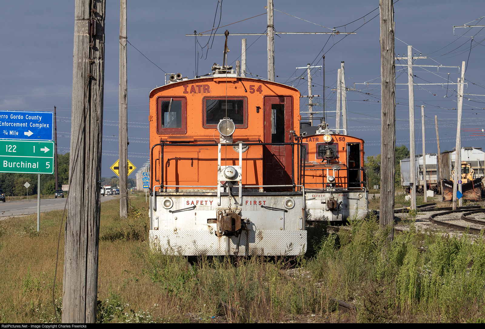 Two of Iowa Traction's active roster of three Baldwin Westinghouse steeplecabs are seen in a HOT (head-on-telephoto) in the railroad's Mason City Yard, Mason City, Iowa, 9/25/23. The 50, on the right, is actually working, switching cars. The 54 is silent and would end up having the entire day off, not moving from this spot until the following morinng. These motors are 93-years old (50) and 90-years old (54). They have an 85-year-old companion out on the line, (51). How beyond incredible that they are still working in every day freight service? I will note, much like cab leading end cab switchers, steeplecabs are not that photogenic in HOTs, but somehow with two of them together, I liked it.