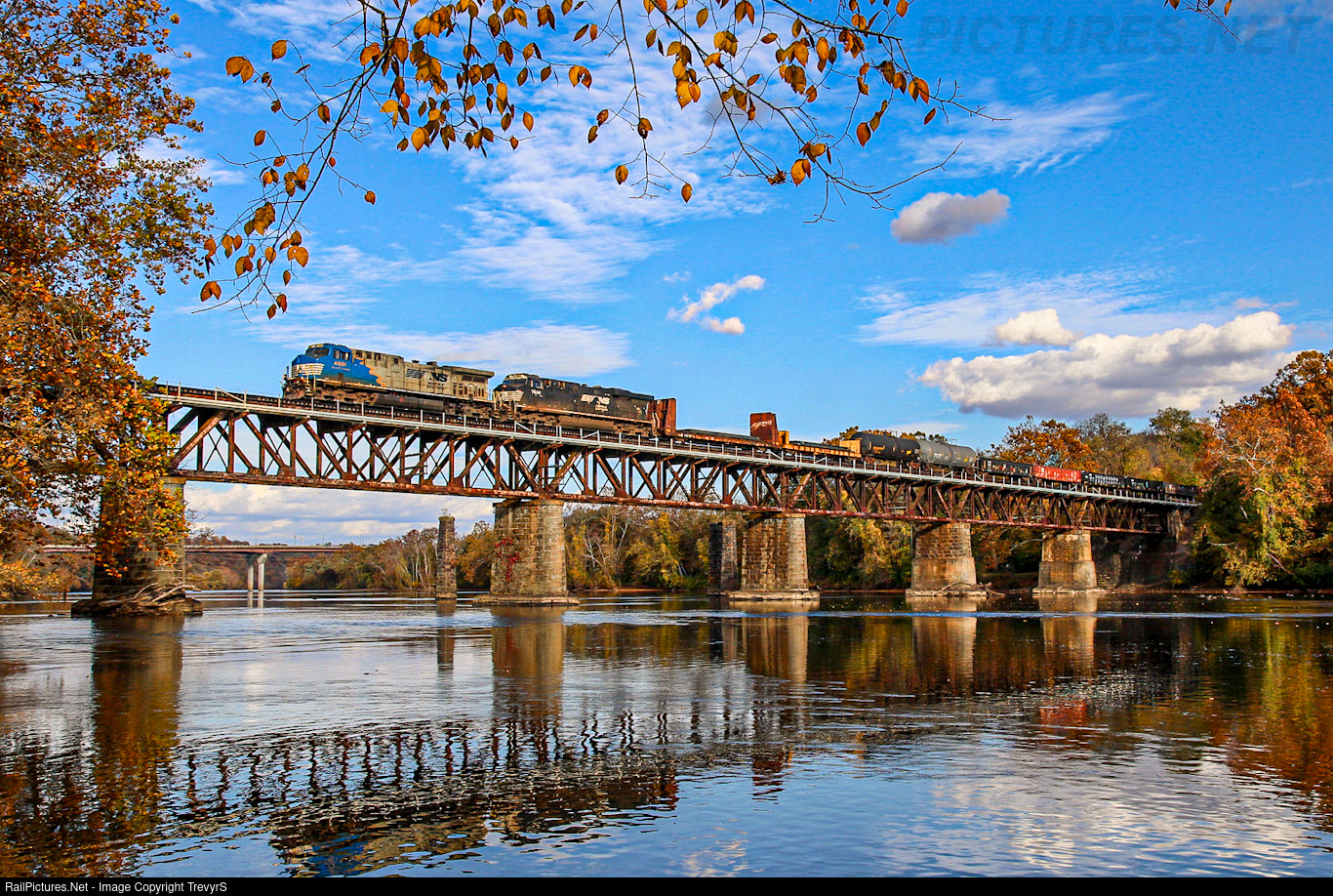 | NS 127 crosses the New River in Radford, VA after spending the day in the yard. The lead locomotive is the 4001, the second C6M completed by NS. |