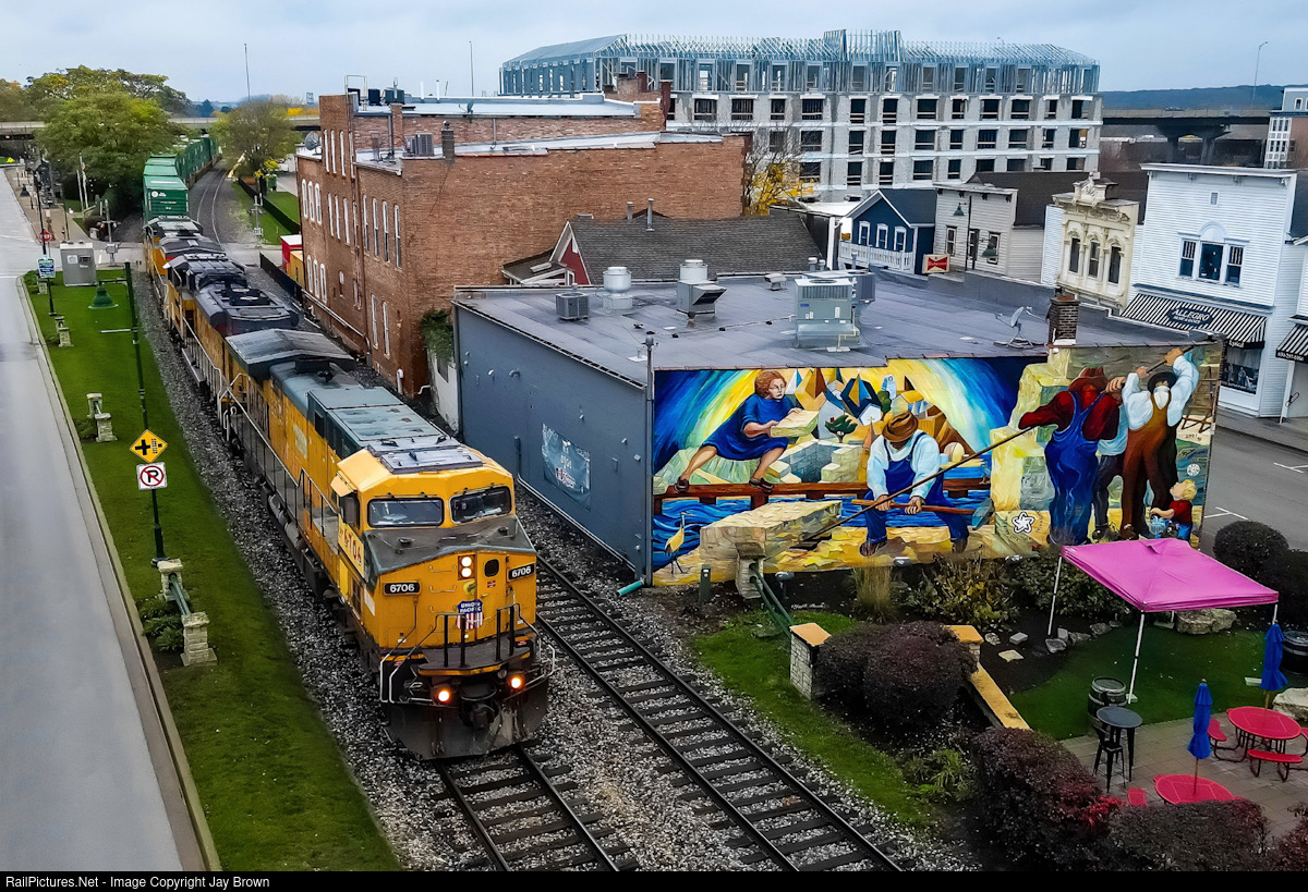 After going missing in action for nearly two years, for PTC and other miscellaneous upgrades, the sole Chicago & NorthWestern painted locomotive left on a class one railroad, heads point on an intermodal transfer. This train, from UP’s Global IV in Joliet, to NS’s Ashland Ave. yard in Chicago, is seen here waking up Lemont in the gloomy early morning hours.