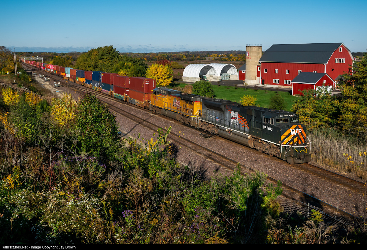 | On the first chilly morning of the season in Chicagoland, UP’s Western Pacific heritage locomotive rumbles east with stacks for UP’s Global IV yard in Joliet. This iconic spot may not have too much time left, with weeds and bushes becoming a noticable issue. |