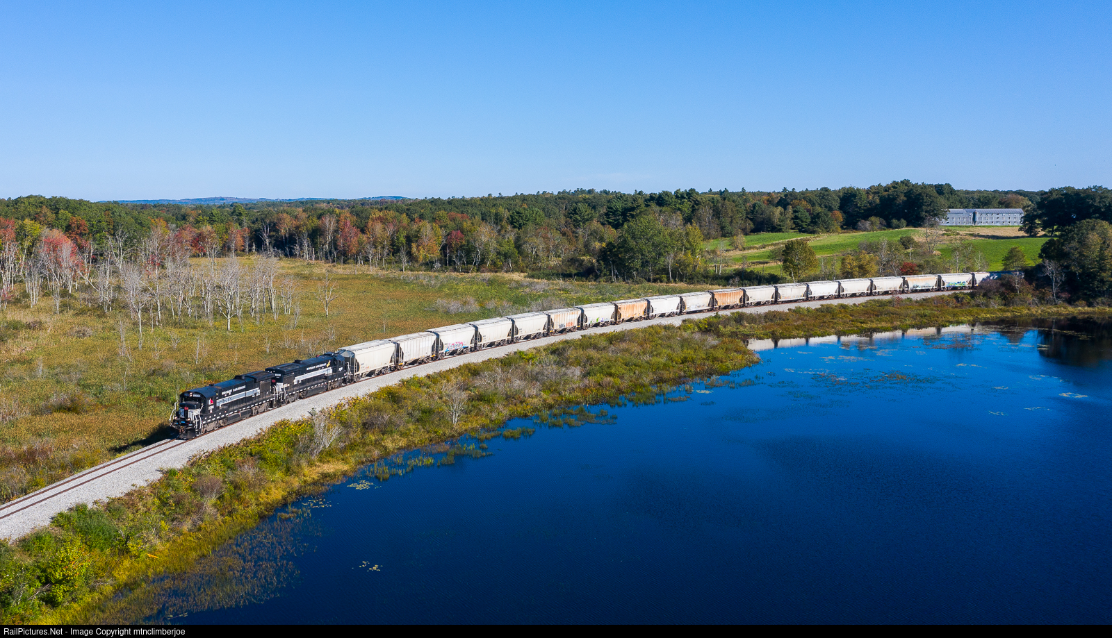 | A pair of GE B23-7's lead the Midcoast Railservice's westbound RB-2 job as it rolls along the banks of Sidensparker Pond outside of Waldoboro, Maine. Today's train has 22 loads of cement from Dragon Products along with a car from Dicaperl Minerals bound for interchange with CSX in Brunswick.