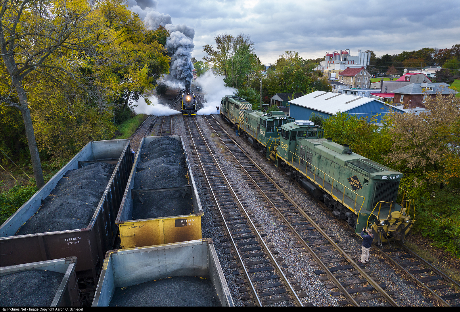 The Fall Leaf special blasts off from Reading Outer Station lead by the RDG 2102. Just starting to pull the steam and smoke show draw photographers in. The train passes by other Reading and Northern power staged just North of the station.