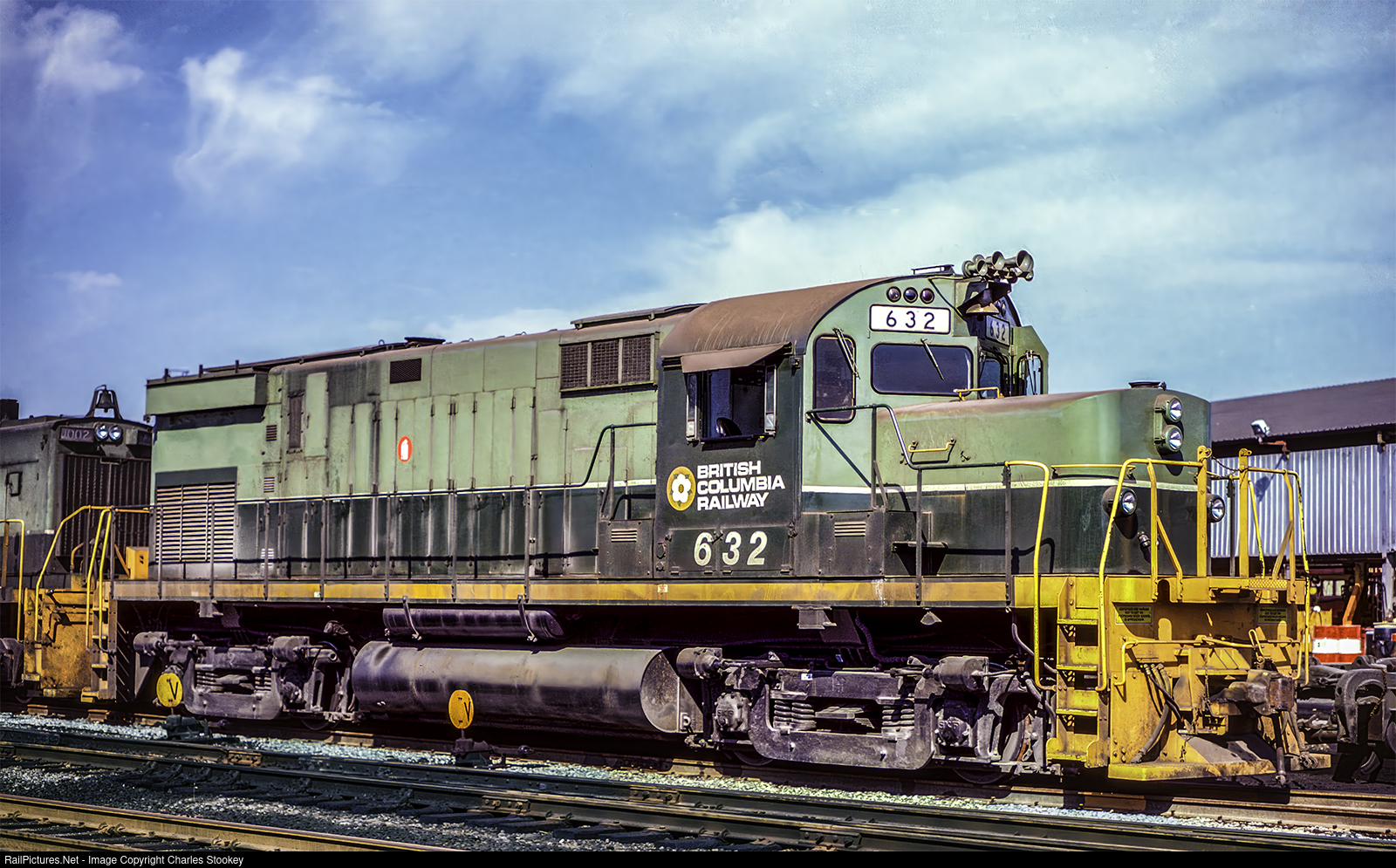 | NORTH VANCOUVER BC Aug 15 1981 — British Columbia Railway C420 632 awaits an assignment. The Alco was built for Lehigh & Hudson River Railway as LHR 26 in January 1966 with builder number 3431-04. It was acquired by BC Rail in July 1972, retired in 2002, purchased by Ed Bowers and leased to Iowa Northwestern as IANW 632. It then went to the Arkansas & Missouri as AM 57. As of Oct 27 2023 it is no longer listed on the AM’s roster. Corrections and additions are welcome. My photo. |