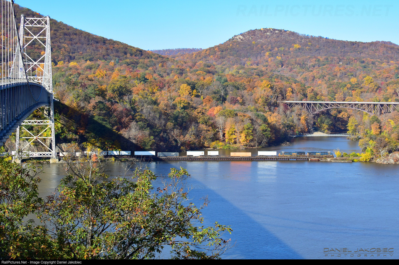Northbound stack train goes up the Hudson River crossing trestle over Popolopen Creek on a beautiful Saturday morning.