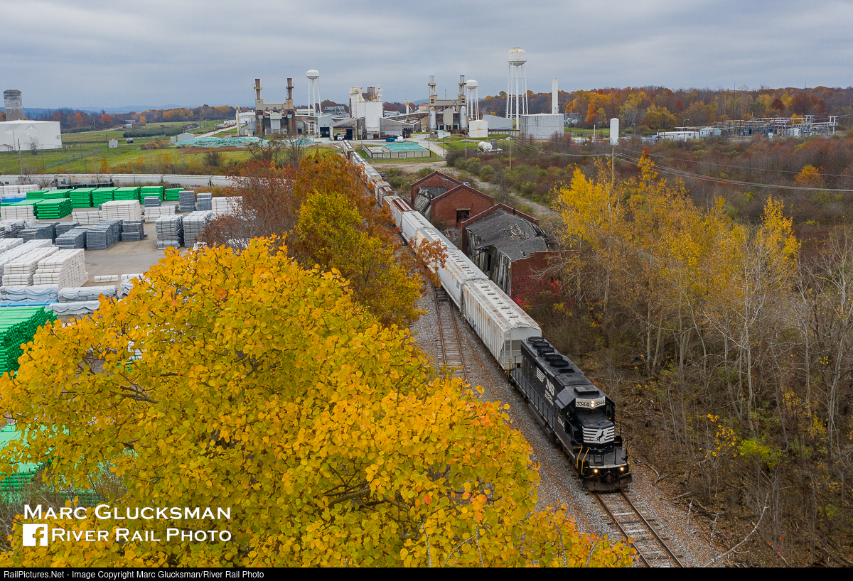 Pennsy Foliage. Norfolk Southern Train C29 was double ended on October 30, 2019, with NS SD40-2 3444 (ex-CR 6309, exx-PC 6056, née-PRR 6056, SD40, EMD, 2/1966) facing railroad south in the midst of colorful trees in Cochranton, Pennsylvania, the inclement weather offset by the seasonal foliage. Even then the 53 years six-axle was earning its keep in its home state on a daily turn.