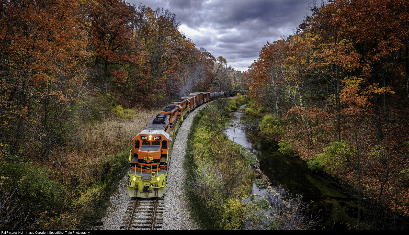 Fall color about to peak , streams and water , SD40-2's screaming Southbound with a decent length train in Michigan, what more can you ask for. Marquette Rail , running South from Baldwin to Grant Michigan. They made their run up from Sparta to the Baldwin yard to hand off cars for ludington pickup and grabbed cars to go back South