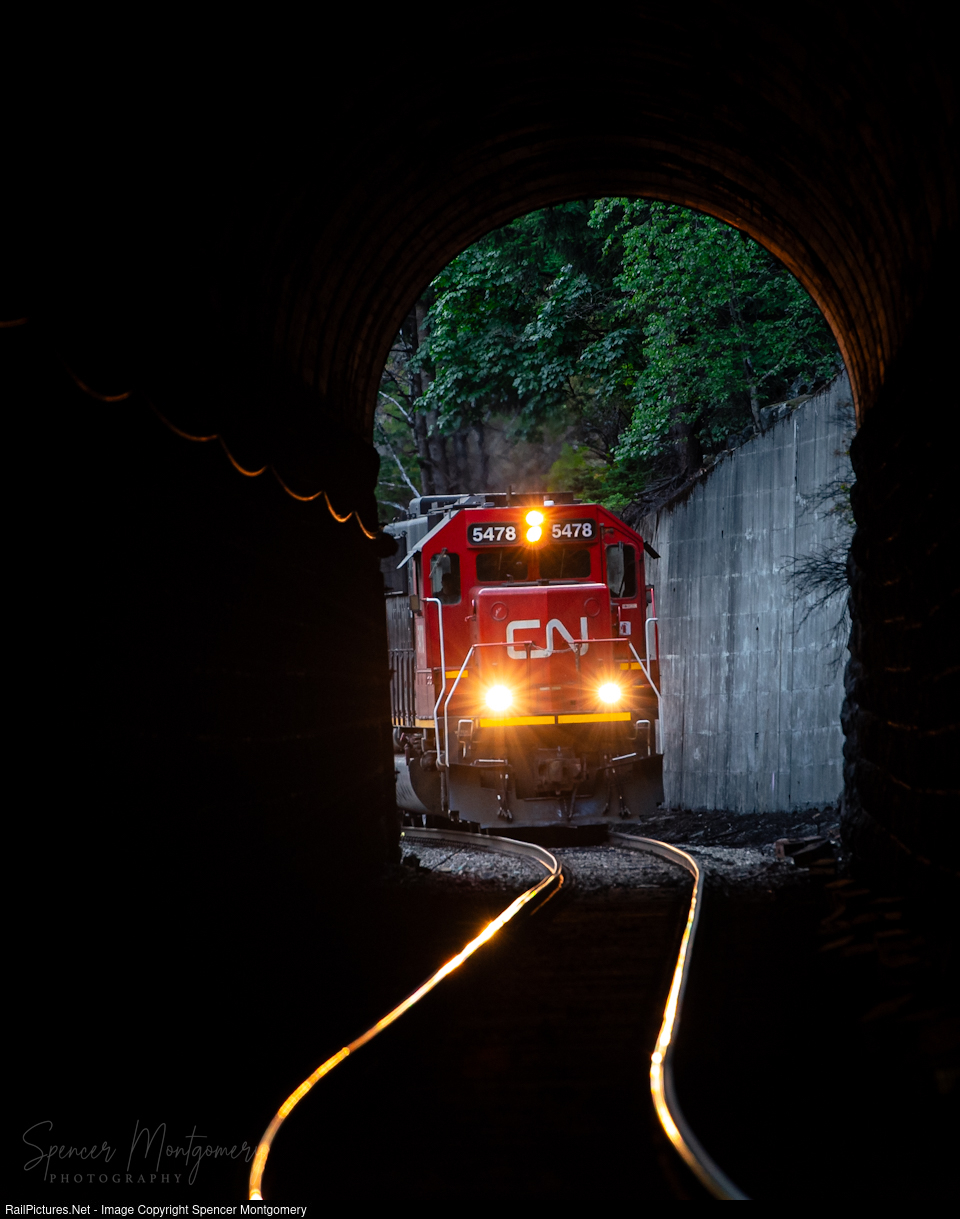 Not to common anymore, CN 5478 leads C700 through the tunnels at Yale with 100 empty sulphur cars in tow.