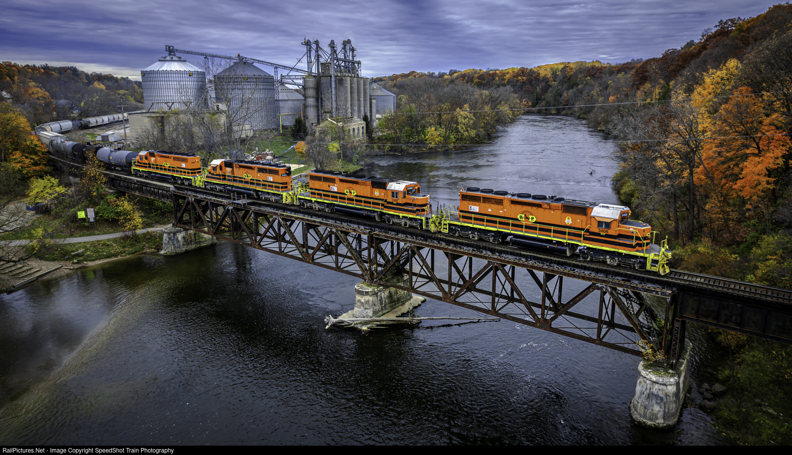 Marquette Rail Z151-29 Northbound with four leaders and quite a decent length train. Here they cross the Muskegon River in downtown Newaygo with some decent Fall Color still hanging on.