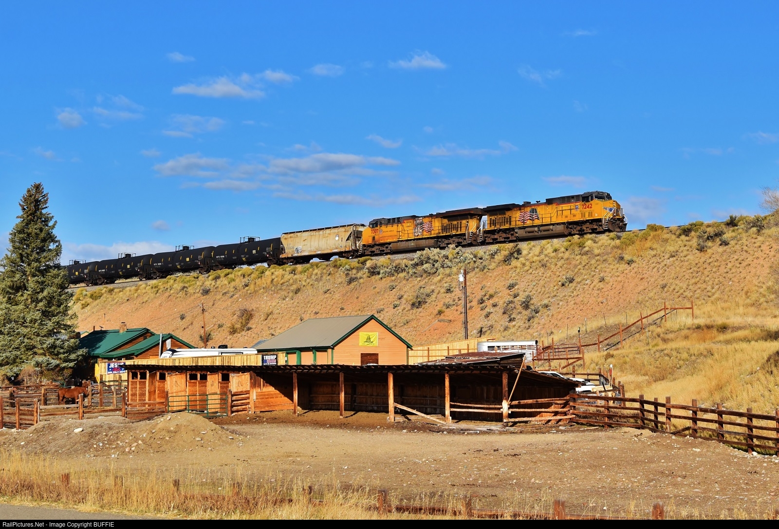 UP 7242 (AC4400CW) takes an oil can train along the high ridge past a ranch west of Hot Sulphur Springs, Colorado.
