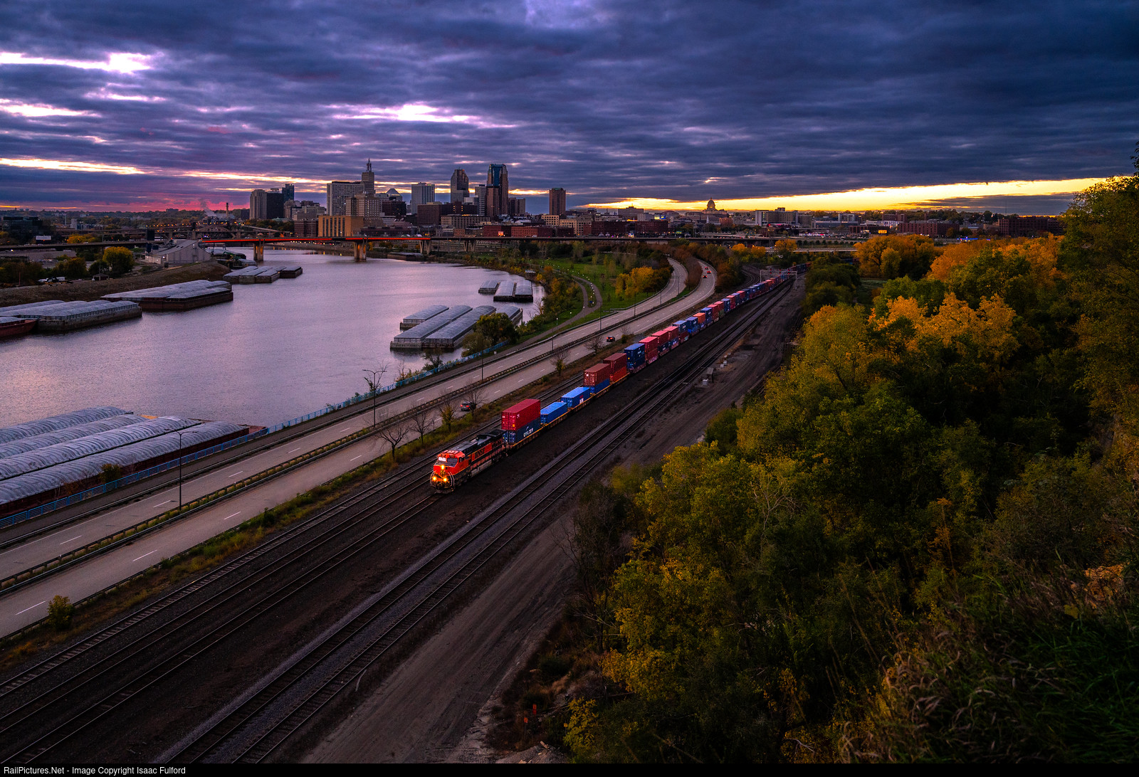 A BNSF Intermodal Train departs the Twin Cities under a cool winter sunset. An H1 Dash 9 pair running 1x1 leads the train into the cold night ahead towards LaCrosse Wisconsin.