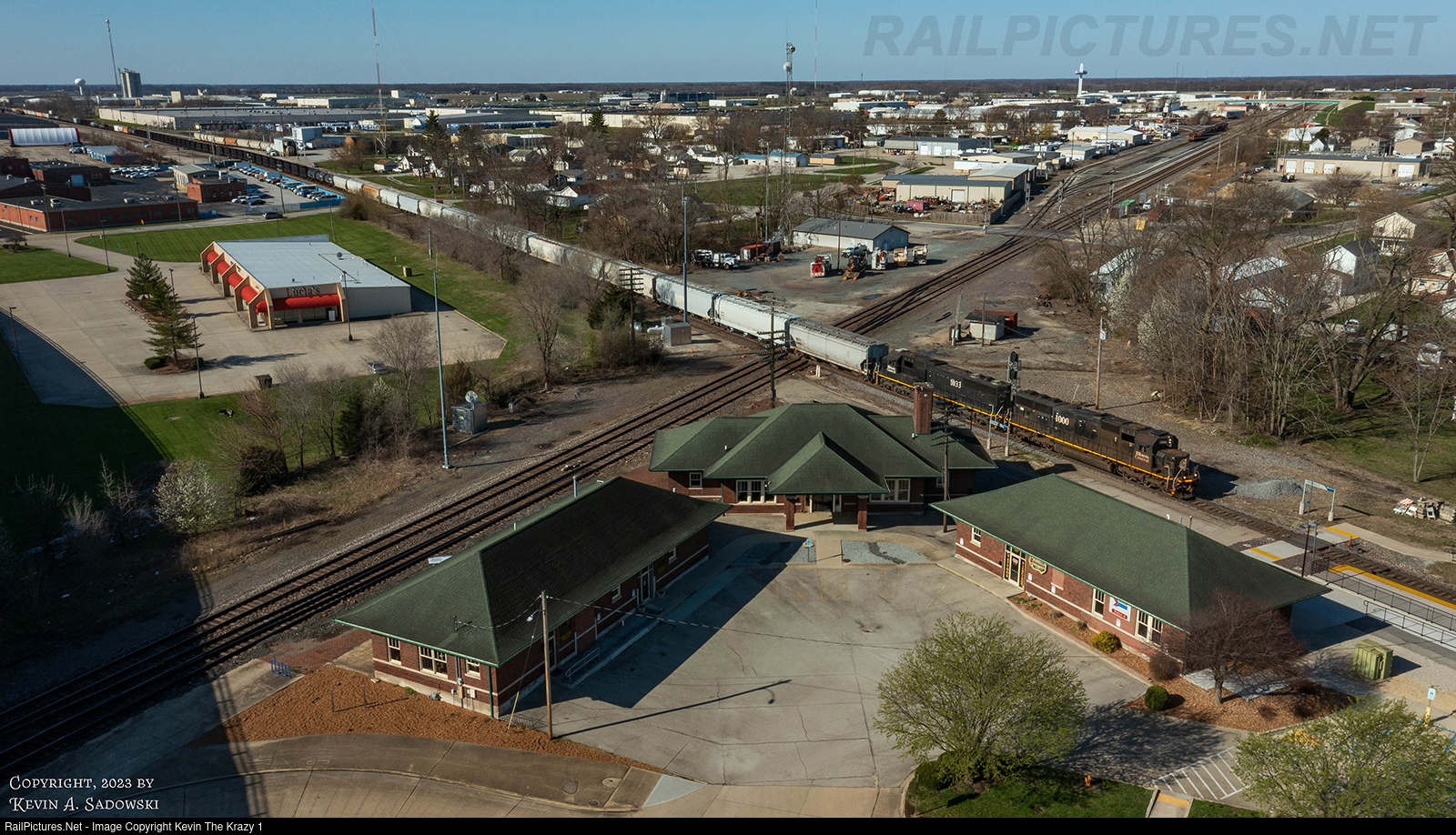 A pair of IC SD70s lead A407 across the cross the CSX main to St Louis and pass by the Amtrak depot at Effingham.