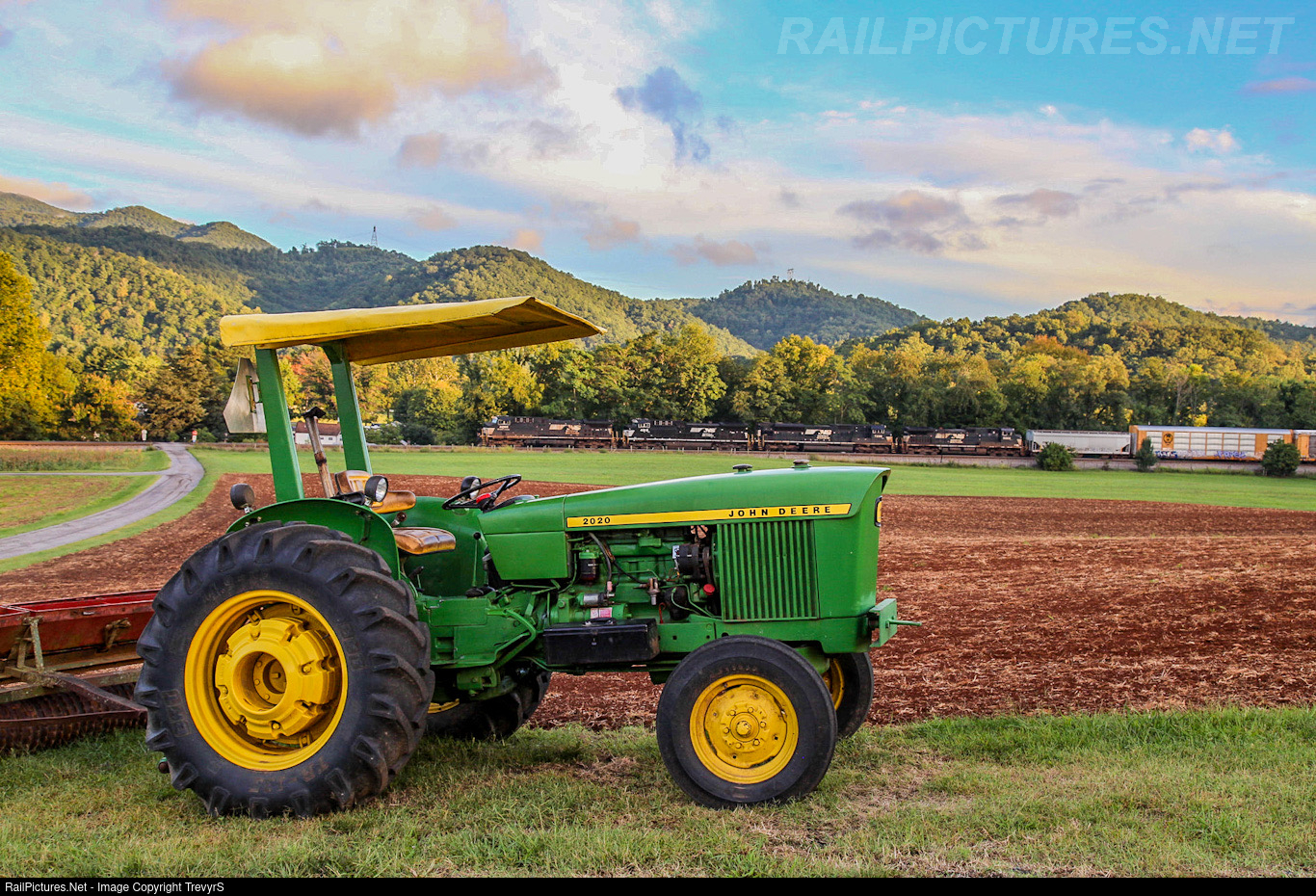 An eastbound manifest drops downgrade through Shawsville, VA and an old John Deere tractor.