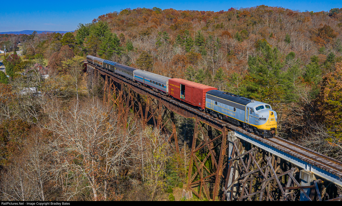 Clinchfield #800 leads a Lhoist North America Employee Excursion Train eastbound across the Time Zone Trestle at Westel, TN.
