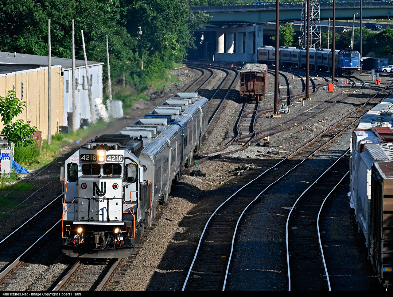| It's train time at Hillburn as 4216 hustles past NJT's Suffern Yard with a Port Jervis-bound consist in tow. Moments earlier, Metro North 4912 arrived in the yard to lay over before returning east to Hoboken. |