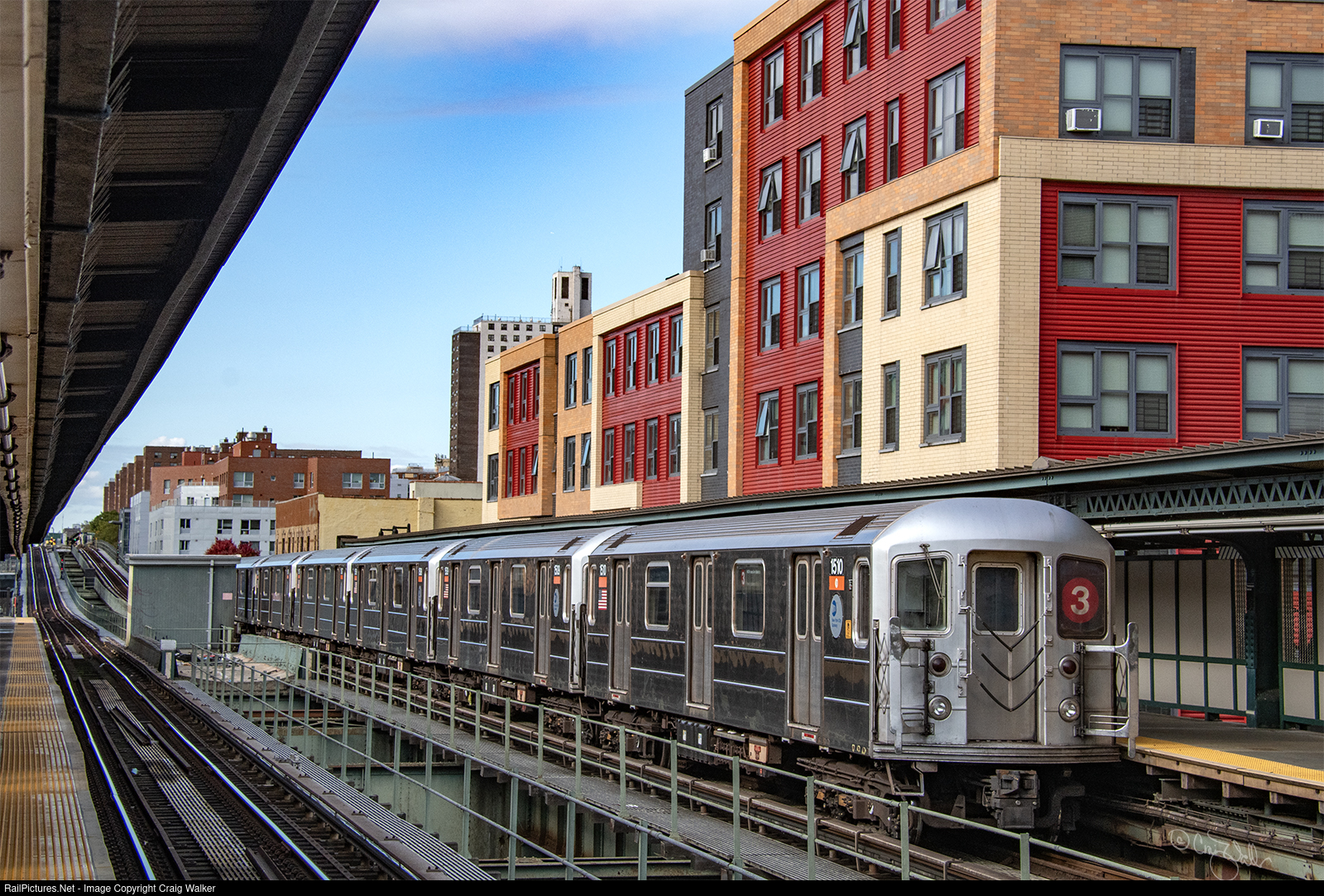 A New York City Transit 3 Train departs the Pennsylvania Avenue Station, in Brooklyn, on its way from Brooklyn to Harlem. This train is made up of Kawasaki R62 cars, with NYCT 1565 leading and NYCT 1510 trailing. (New York, New York – October 31, 2023)