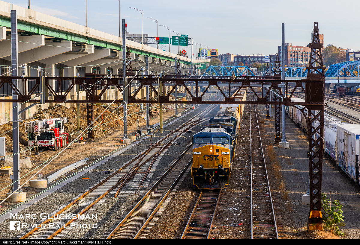 Leggett Interlocking. As CSX Y101-04 (CSXT 473 leading) prepares to depart Oak Point Yard on Saturday, November 4, 2023, the transitional scene is very much in evidence. In preparation for adding MTA Metro-North Railroad trains to the Amtrak Hell Gate Line, the vintage New York, New Haven, and Hartford Railroad catenary gantries are being replaced with modern fixtures. The train is passing the future "Leggett Interlocking" with about half of the switch installation completed.