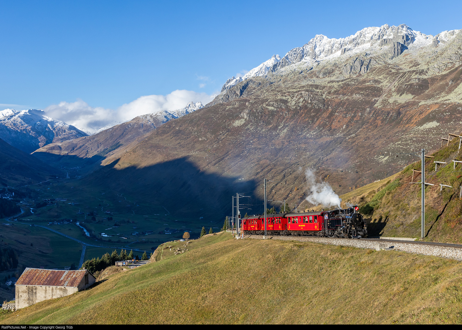 | With the Urseren valley and Andermatt still in shadow, the steamtrain of the Dampfbahn Furka Bergstrecke on the line of the Matterhorn-Gotthard-Bahn from Realp via Andermatt-Oberalp pass-Sedrun to Disentis and back is tackling the grade up to Nätschen, with cogwheel locomotive HG 3/4 # 4 of 1913. Once, this locomotive circulated regularly on this line as HG 3/4 # 4 of the Furka-Oberalp-Bahn (FO). |