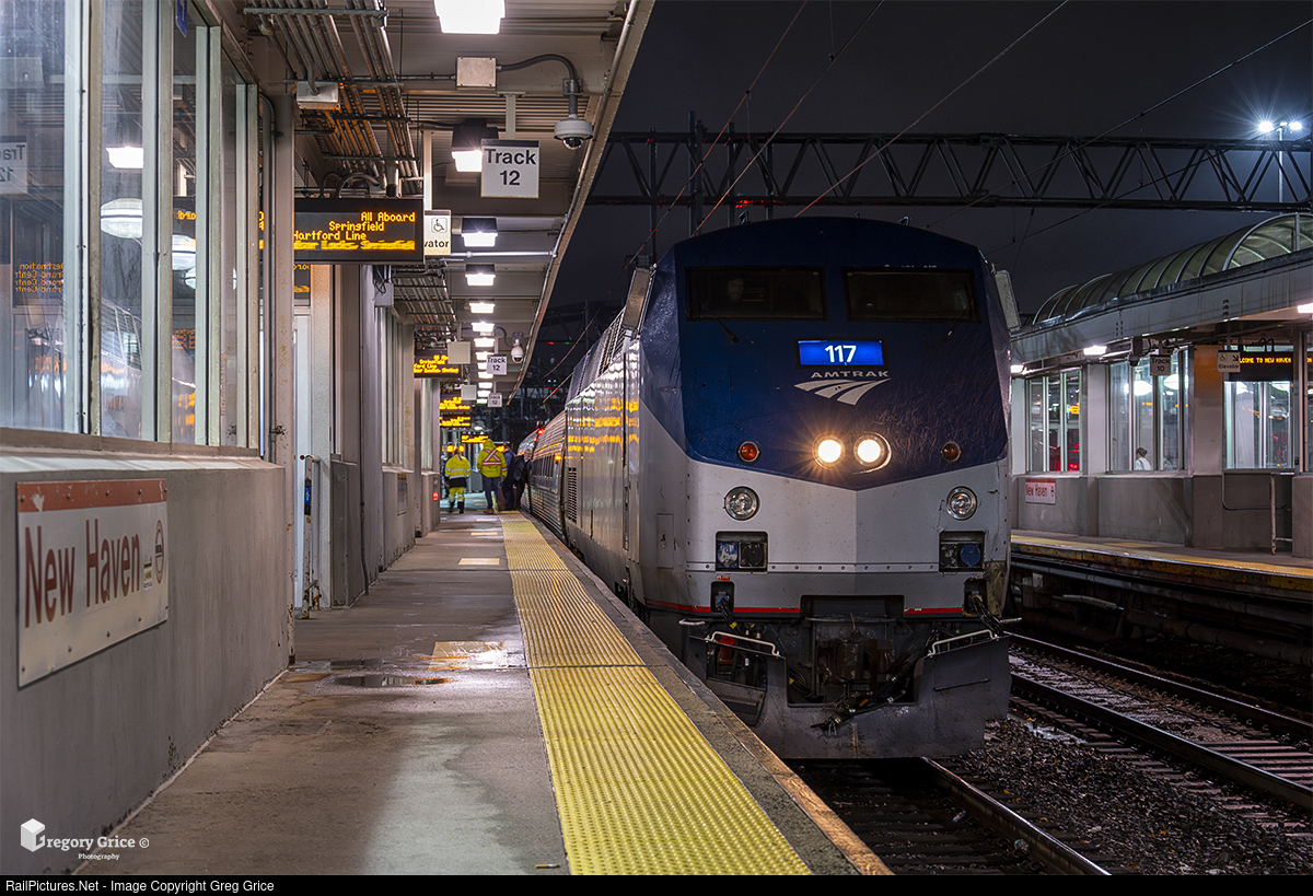 On the rainy night of October 29th, 2023, Amtrak Hartford Line Shuttle 416, with GE P42DC 117 leading, gathers its final passengers prior to departing off of Track 12 at New Haven Union Station in Connecticut. Amtrak trains and trains traveling through the station without a scheduled stop usually use Tracks 1-4, but these tracks were out of service at the time due to catenary wire damage.