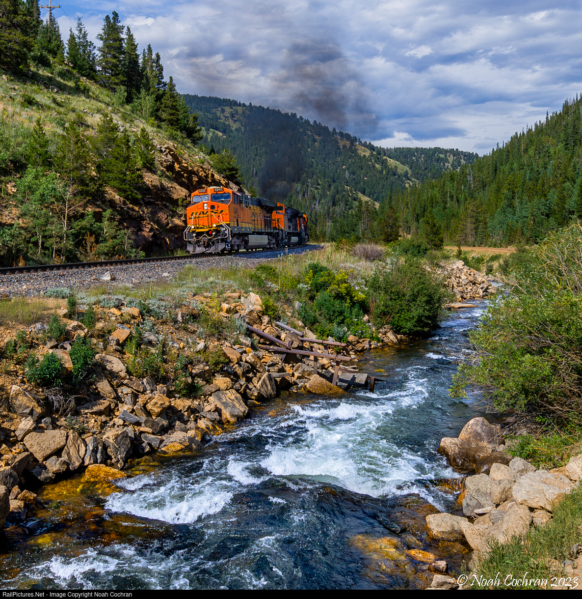 A warm summer afternoon in the Rocky Mountains trackside along Union Pacific’s Moffat Tunnel Subdivision sees a BNSF Denver, CO to Provo, UT trackage rights manifest making the westbound trek up the mountain. Framed just a few miles east of the Moffat Tunnel, we see them snaking through Tolland, CO parallel to the South Bolder Creek as they approach East Portal.