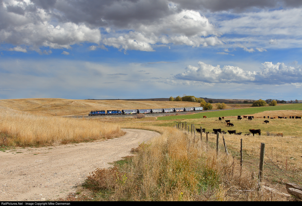 On October 10, 2023, Montana Rail Link’s 844 local proceeds downgrade between mileposts 7 and 8 north of Harrison, Montana, with seven cars of grain from the Harrison Elevator Co. Leading the train is MRL EMD GP35 No. 401, a former DT&I unit built without dynamic brakes, so it’s all air going down the 2.2 percent grade to Sappington as they pass a herd of cattle.