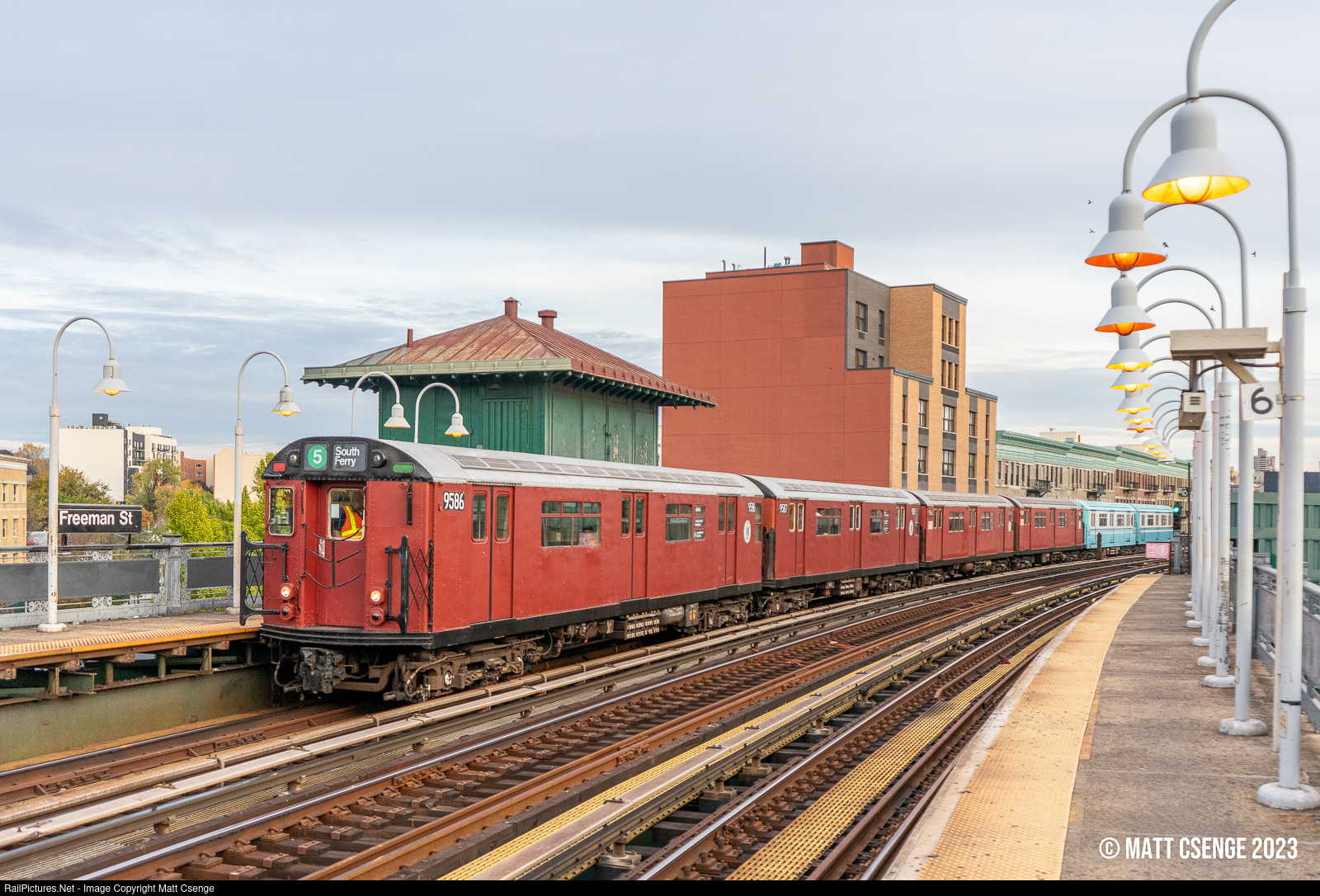 Morning Museum Move. New York City Transit Authority (NYCTA) R36WF no. 9586 (St. Louis Car Co., 1963-1964) leads a NY Transit Museum train south through Freeman St Station on the IRT White Plains Road Line. Behind the train is an out of service signal tower, which once controlled an interlocking north of the station where elevated trains would turn to return to Manhattan.