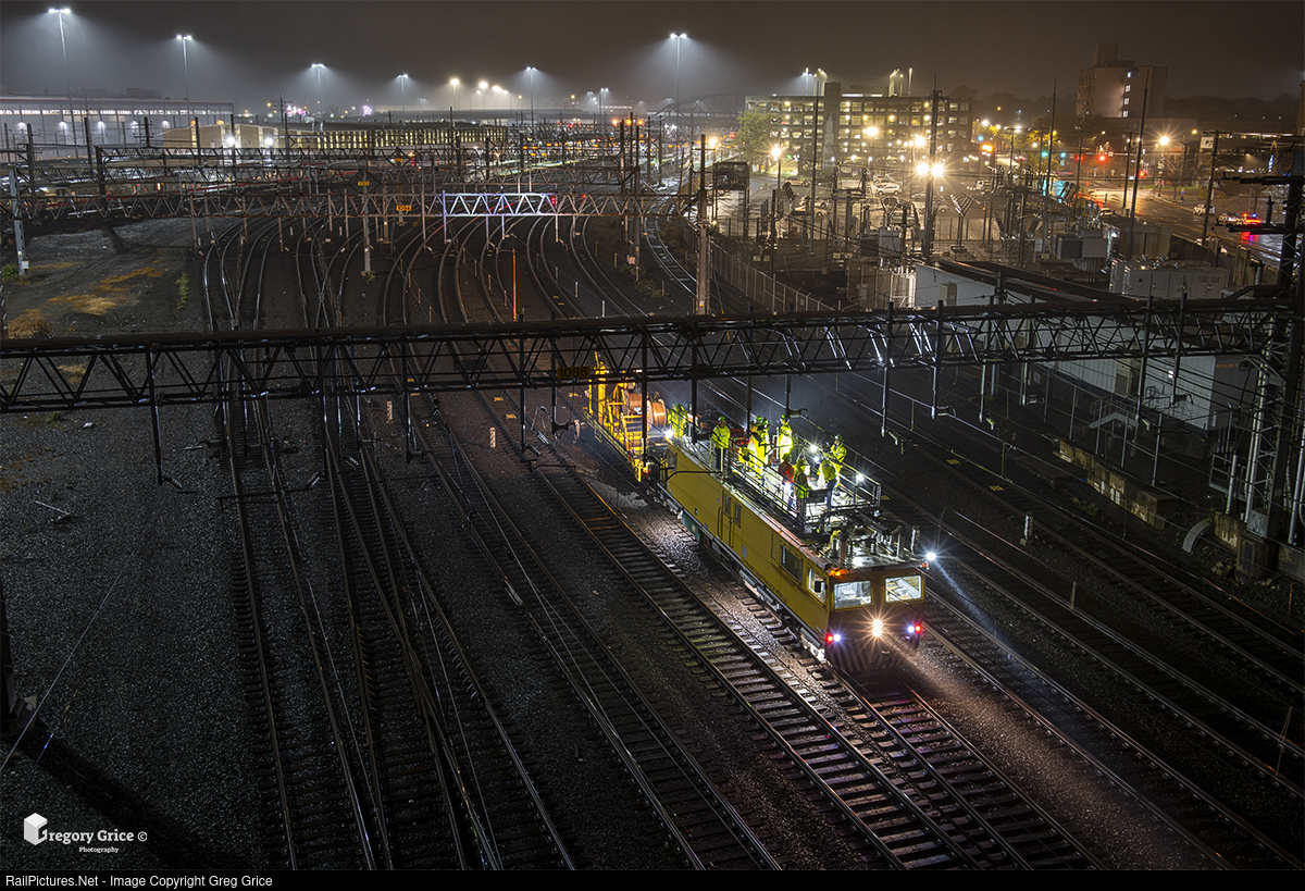 Just after midnight on October 30th, 2023, Metro-North Railroad Electric Traction employees are hard at work in the rain repairing damaged catenary wire just east of Union Station at CP 273 on the New Haven Line in New Haven, Connecticut. CP 273's interlocking structure dwarfs the Plasser Catenary Maintenance Vehicle (MNCW CV1004), a vital asset within the Electric Traction Department's arsenal.