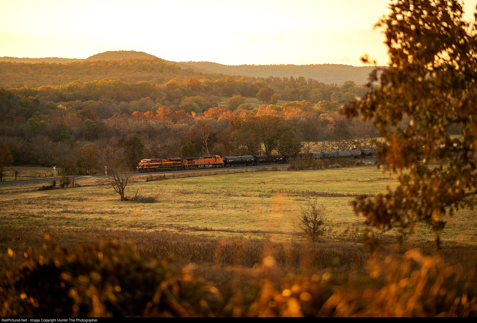 Southbound At Sunset | Just a couple of minutes before the sun drops below the horizon, southbound CPKC manifest train M280 rolls through the valley at Bunch, OK on the gorgeous past-peak fall evening of Sunday, November 5, 2023.