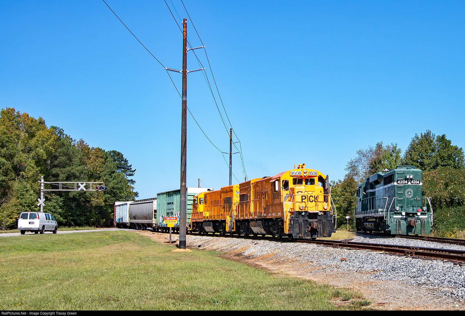 | Handoff. The PICK enters the GRLW interchange near Belton, where it will pull forward and allow the waiting GRLW unit to connect to the train and pull forward to proceed to Pelzer. |