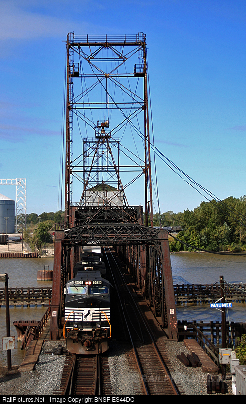 A NS double stack train crosses the swing bridge at CP Maumee.